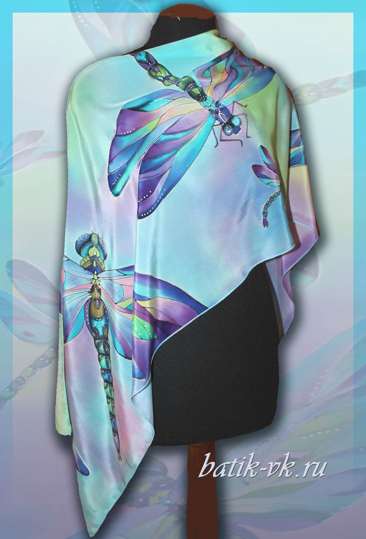 Шёлковый шарф со стрекозами в лазурных, фиолетовых и розовых тонах.